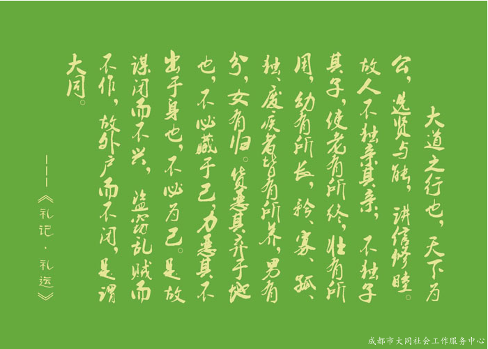 大同名源: 大同之名源自(zì)《禮記 ▪ 禮運》:大道(dào)之行也,天下為(wèi)公,選賢與能,講信修睦。故人不獨親其親,不獨子(zǐ)其子(zǐ),使老有所終,壯有所用,幼有所長(cháng),矜、寡、孤、獨、廢疾...詳細>>