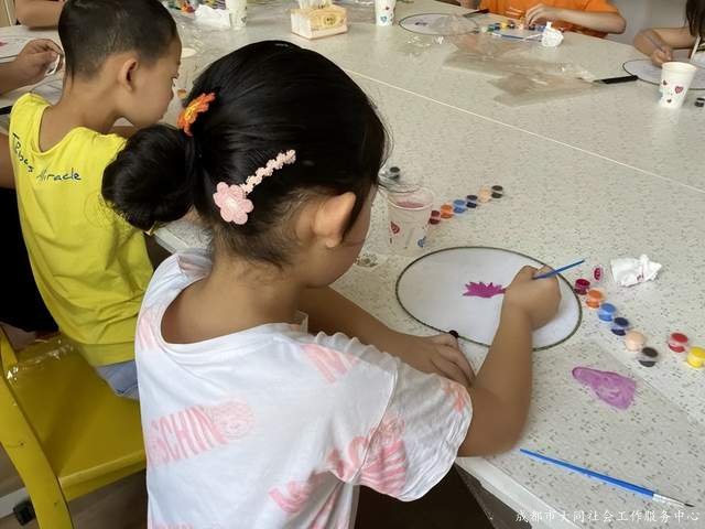 活動伊始,由成都大同社工向兒童介紹了團扇的(de)有關知識,中國扇文化是起源于遠古時代,我們的(de)祖先在烈日炎炎的(de)夏季,用身邊随手可(kě)取的(de)植物葉或禽羽進行加工用于驅熱引風,這便是扇最初的(de)形成。社工在提醒兒童彩繪材料的(de)使用技巧和(hé)注意事項後,兒童都十分熱情地(dì)投入進團扇制作的(de)樂(yuè)趣中。